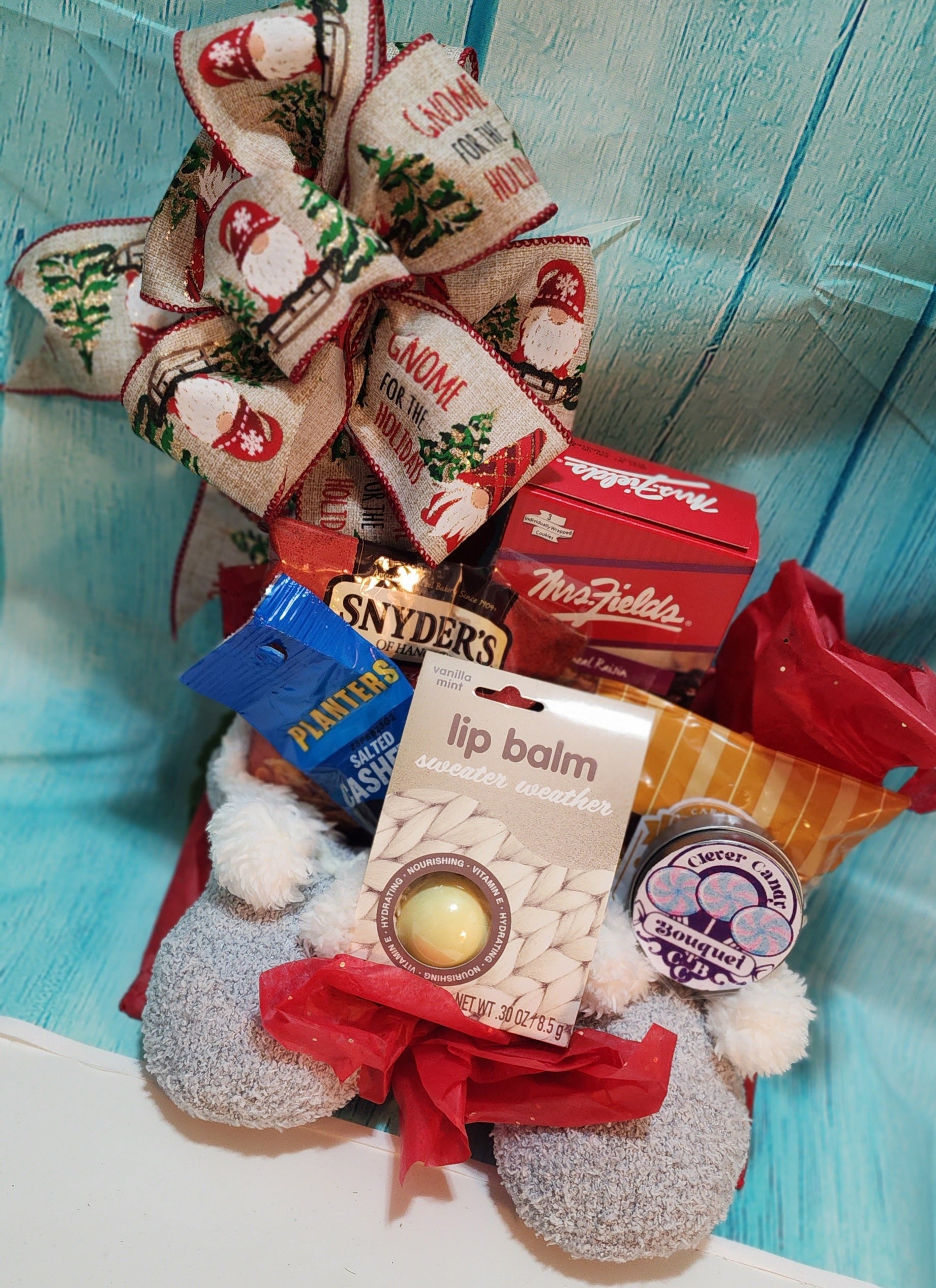 Slipper and snacks, Peanuts, Oatmeal cookis, Lip Gloss, Carmel popcorn and pretzel pieces and a clever candy tin filled with Jelly beans that are sugar free